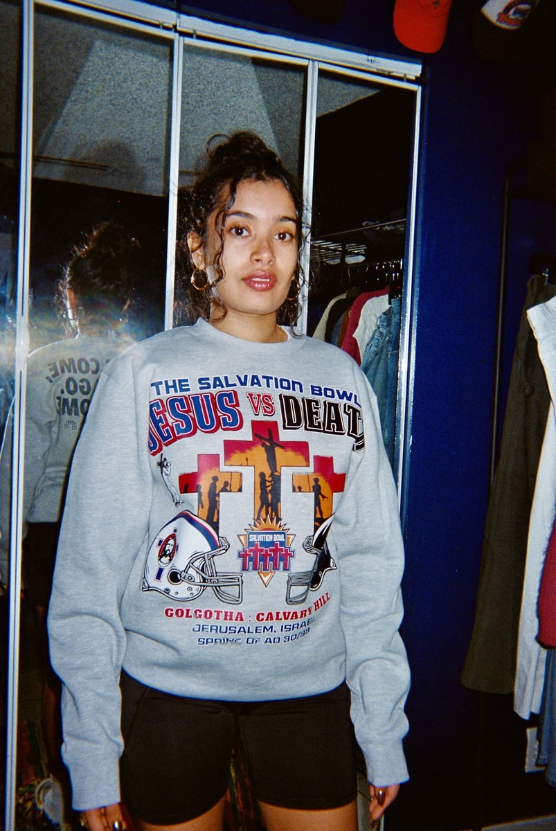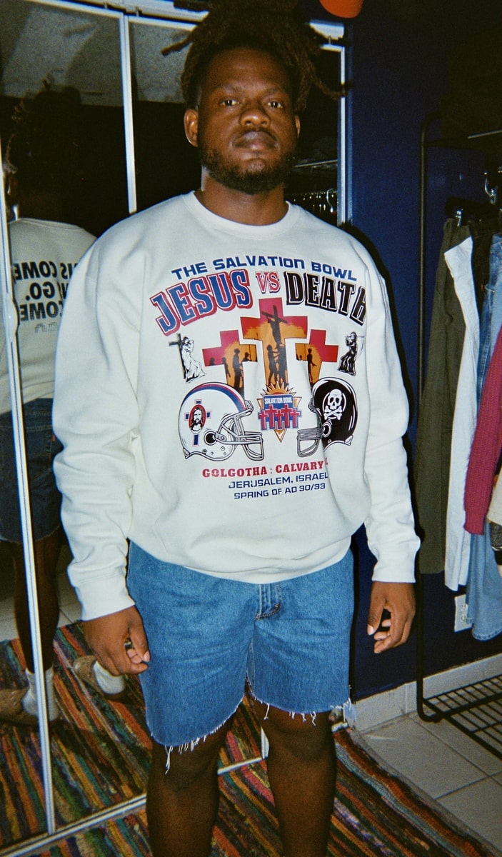 Embark on a spiritual journey with our “Jesus vs Death” heavyweight crew neck sweater, a unique blend of faith and vintage sports aesthetics. This one-of-a-kind crew neck pays homage to classic Super Bowl styles, offering a bold Christian twist to traditional sportswear.