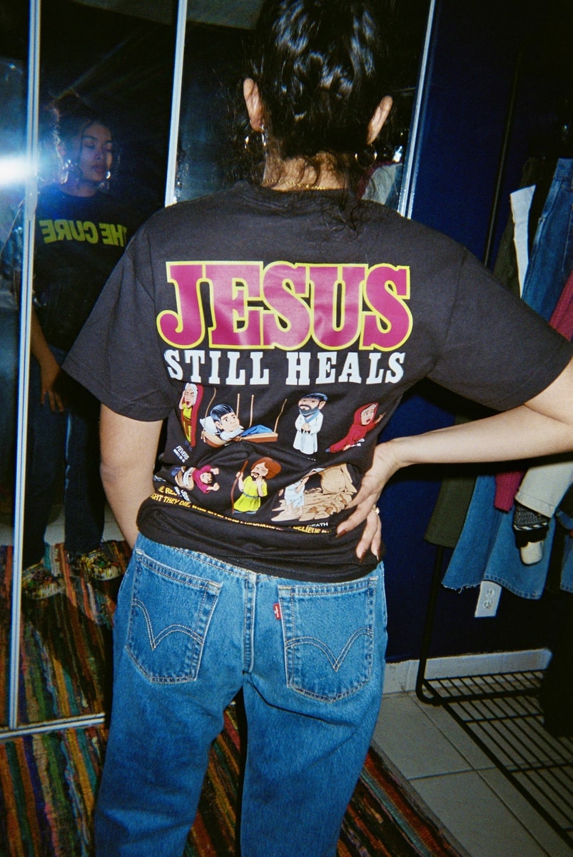 Discover a blend of faith and retro charm with “The Cure” t-shirt. This unique piece brings to life the healing miracles of Jesus from the Bible, depicted in an engaging vintage cartoon style. It’s a fusion of spiritual depth and playful artistry, perfect for those who appreciate both.
